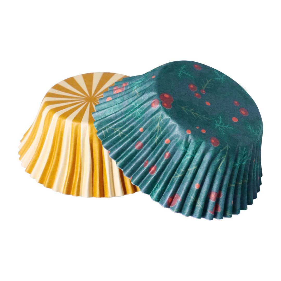 Set includes 2 designs x 12 baking cases of each, with 24 double-sided paper toppers. Features a Poinsettia & Mistletoe theme.