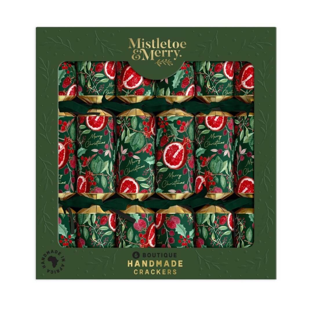 These Boutique Rich Pomegranate Crackers embrace nature’s goodness with the fruit almost bursting out from each handmade cracker. Accentuated with gold-tones at each end, tied with lush green ribbon and with a Merry Christmas message, these crackers will be a delicious addition to your feast.