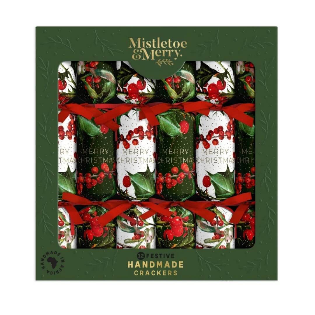 These Handmade Festive Holly & Berry Sprigs Cracker Set is draped with lush red berries in contrasting green and white bonbons. The gold-toned message on each one reads Merry Christmas Each one is tied with bright red ribbon and with 12 crackers in this set, you can afford to spread joy hither and thither.