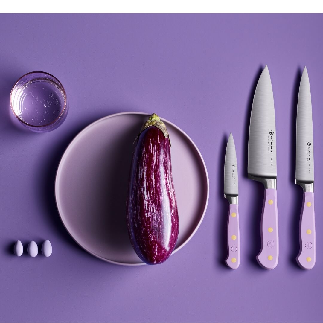 Available in seven gorgeous colourways, Wild Blueberry, Fresh Rosemary, Velvet Oyster, Tasty Sumac, Coral Peach, Purple Yam, and Himalayan Pink Salt. Because great knives should be as individual as the cook holding them. Choose the one that fits your kitchen (or your personality).