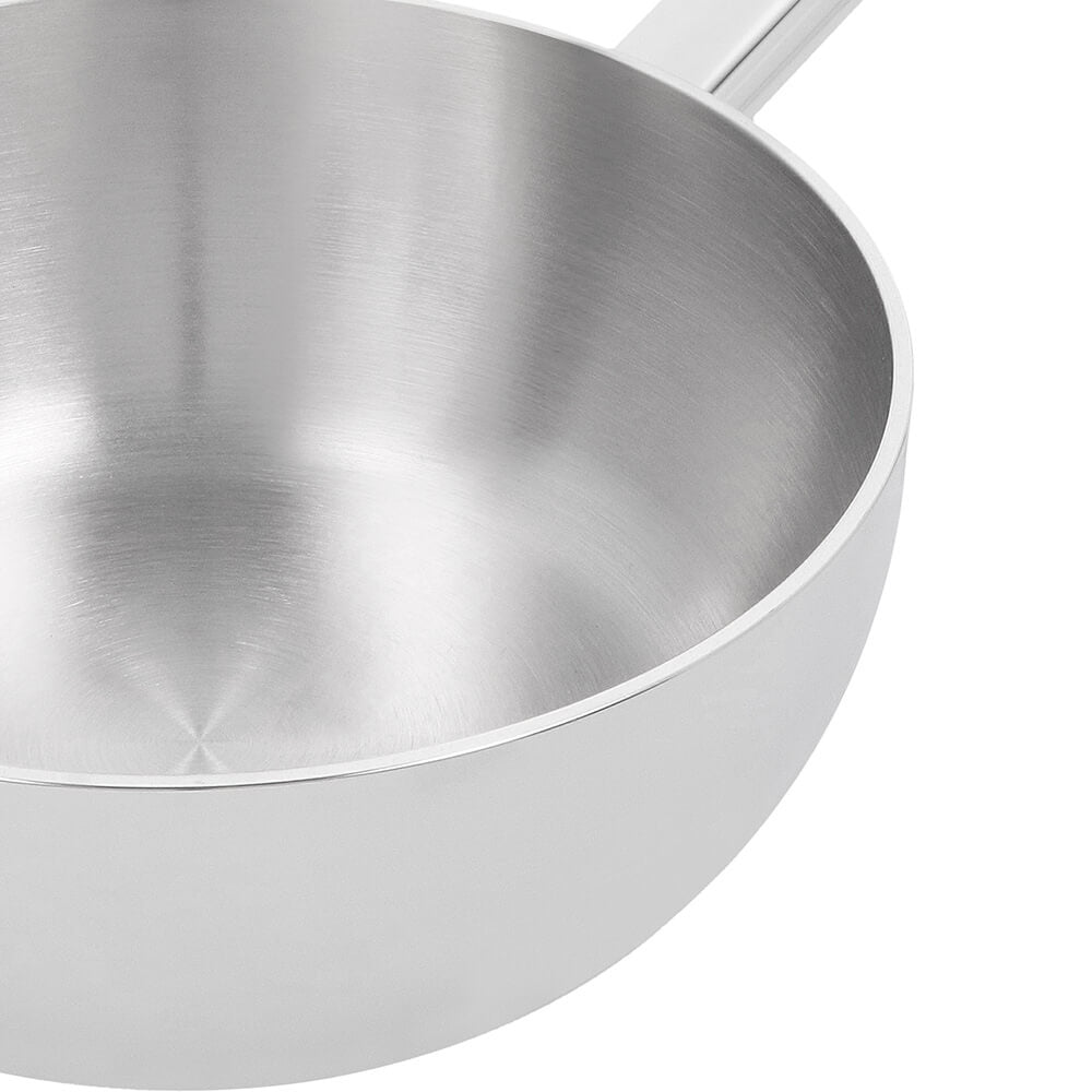 This conical sauté pan is ideal for preparing delicate sauces, the uniform heat distribution prevents curdling or burning and the special curve on the inside is perfect for stirring and whisking. This brings a delicious sabayon or delectable chocolate sauce within everyone’s reach. Also ideal for quick searing of vegetables.