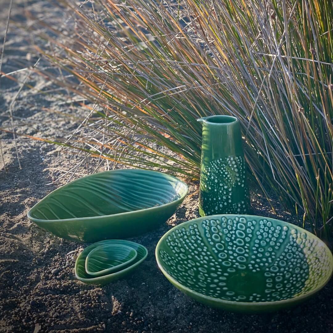 The Mussel series features a textural relief design with a gloss clear glaze inside and outside. Each piece comes boxed with an image of the design on the lid and a story about the meaning of the design on the box bottom, as well as a story card inside about the artist and design.