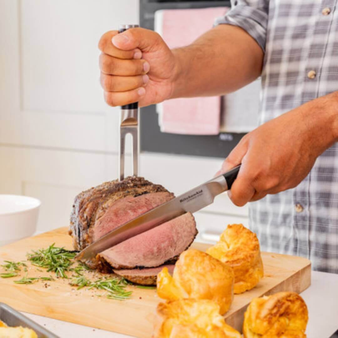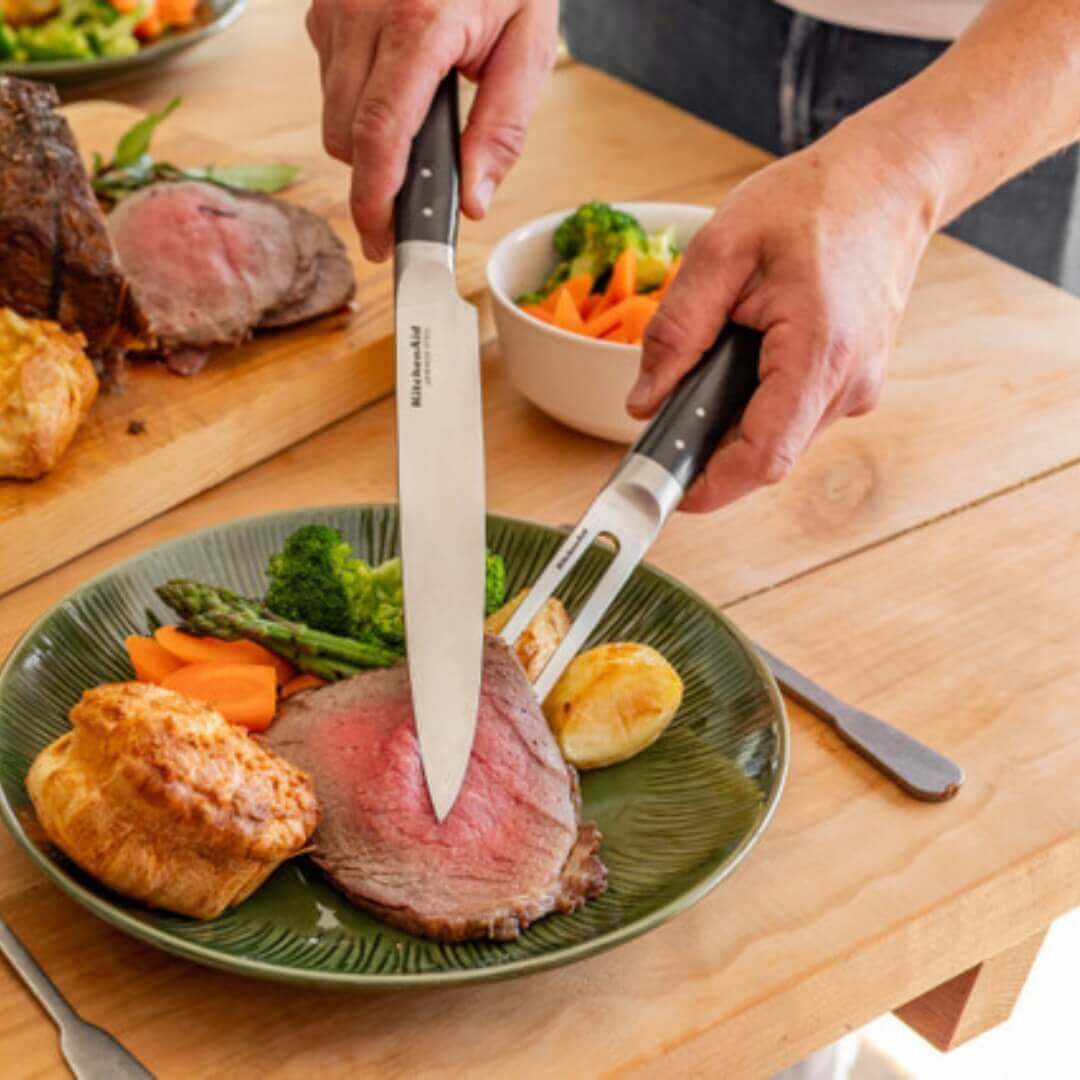 Effortlessly slice and serve with the KitchenAid 2-Piece Carving Set, featuring a sharp 20cm stainless steel carving knife and sturdy 15cm carving fork for precise cuts of roasts, poultry, and more.