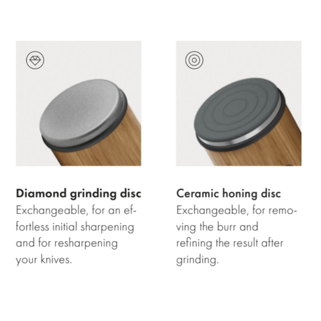 With the HORL®3 and interchangeable grinding discs you have many options. In combination with a constant grinding angle, the diamond and ceramic discs deliver impressive results. 15° produces a filigree, while 20° a stable cutting edge. Developed and manufactured in the Black Forest, the HORL®3 with its natural wood grain of oak or walnut is a stylish eye-catcher in any kitchen. For more pleasure when