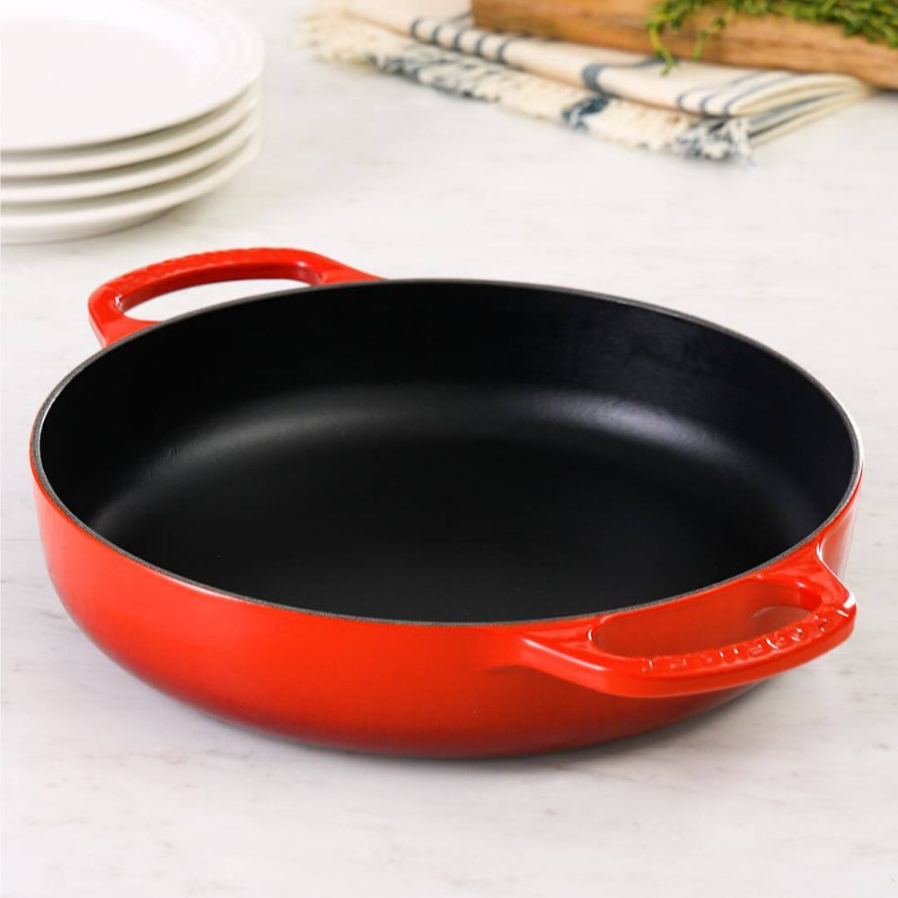 The satin black enamelled cast iron Signature Everyday Pan has a generous depth and wide surface area ideal for pan roasting, frying, simmering sauces, and more.