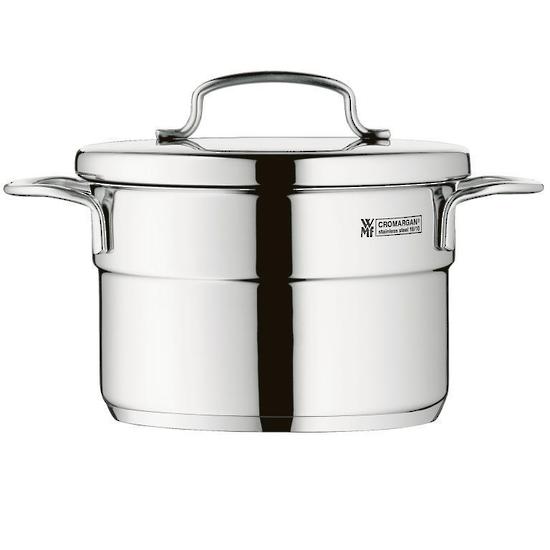 The pots and pans from the WMF mini cookware range series are an indispensable help for any left-overs, for single households and for cooking children’s meals. The mini cookware range can be stacked to save space and the collection has a wide range of pieces. In this practical series you will find everything from roasting pans to serving pans. As with the normal cookware ranges, the mini cookware range is made of high-quality and very durable Cromargan®, 18/10 stainless steel and is, moreover, equipped with the TransTherm® universal base. The mini cookware range has a highly polished surface and is also expertly processed down to the last small detail.