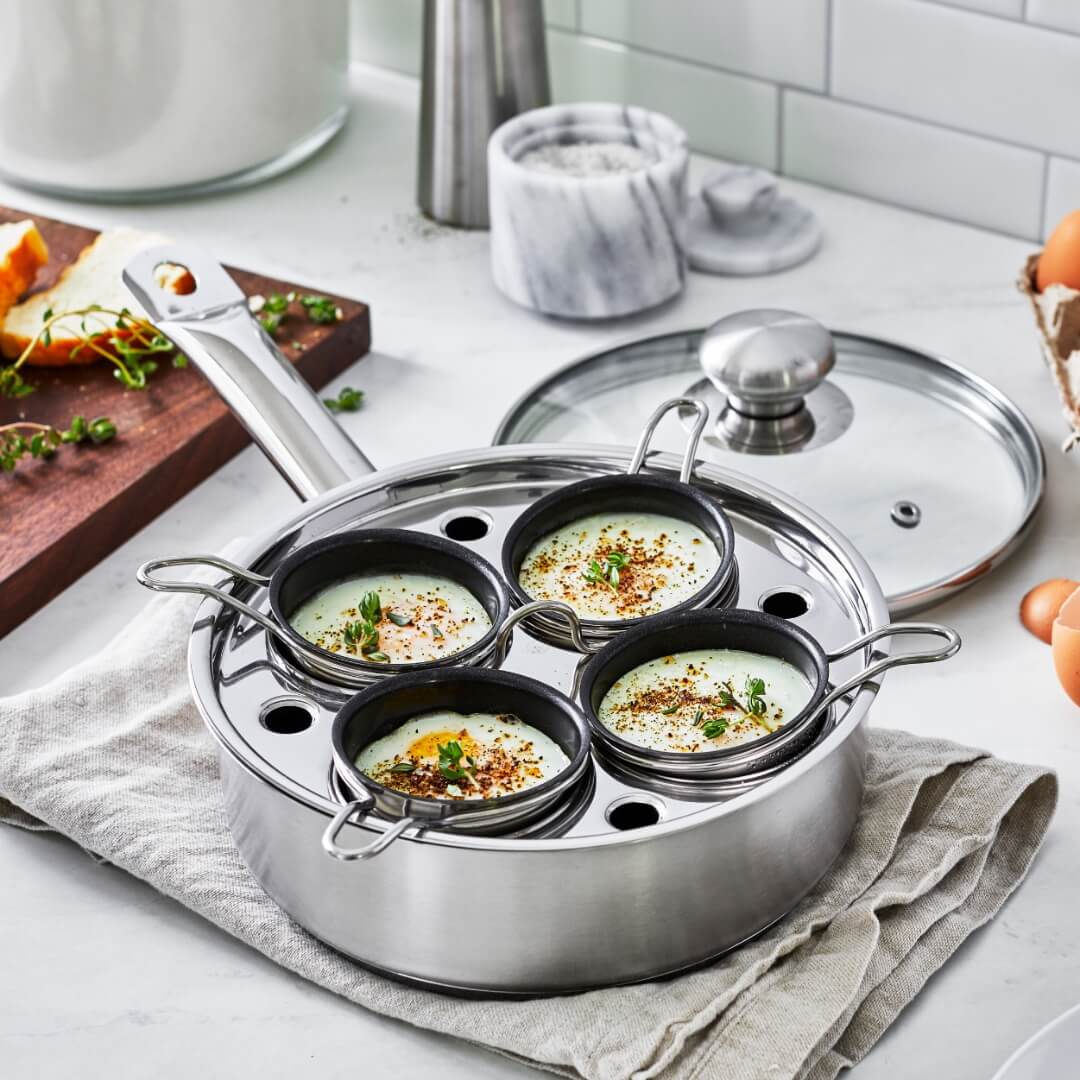 This egg poacher set is the secret to perfect poached eggs. Effortlessly poach up to four eggs at one time in the four removable nonstick cups. Or remove the poaching cups and use as a saucepan to whip up hollandaise or a skillet to sear bacon.