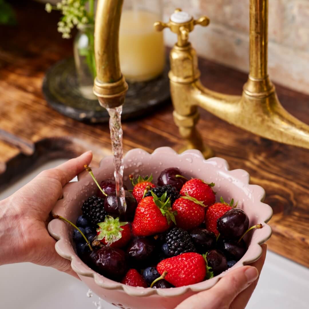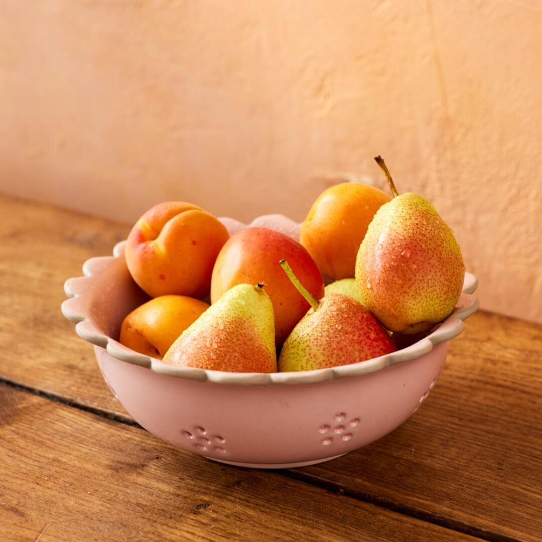 Perfect for washing fruit, rinsing herbs, or storing eggs in style, the Big Love Beautiful Berry Bowl is crafted from sturdy pink speckled stoneware with a charming scalloped edge.