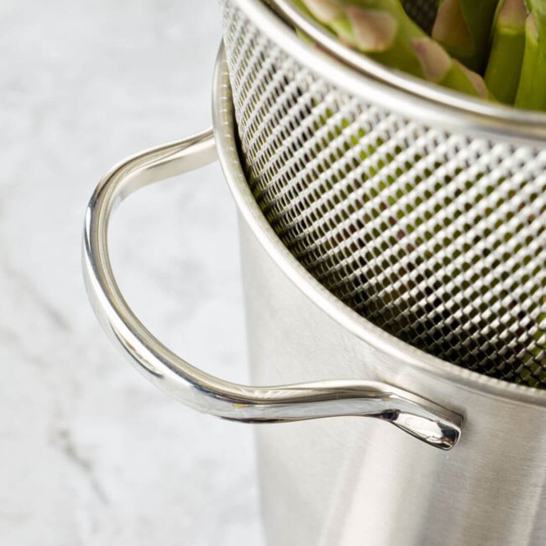 The Demeyere Asparagus/ Pasta Cooker Set is made from 18/10 stainless steel with 2 handles, a lid and an asparagus basket to drain. This asparagus cooker is unique because in addition to the vertical cooking of asparagus, endives or other vegetables it is also ideal for the preparation of pastas. You can also blanch, boil and steam in it.