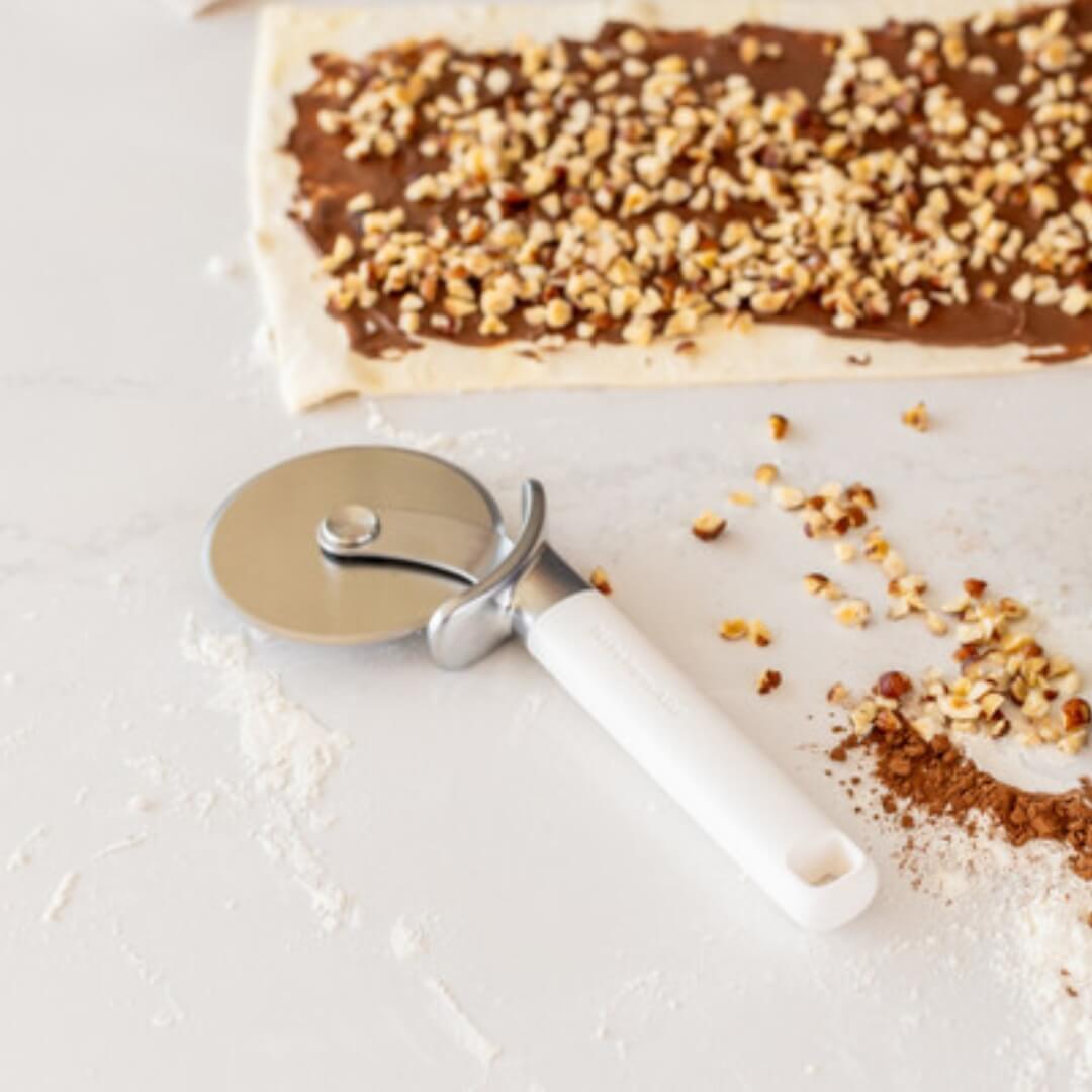There's something deeply satisfying about cutting into a homemade pizza and hearing that perfect crunch. The KitchenAid Pizza Wheel in Porcelain White is designed to make that moment effortless every time. With its super-sharp, angled stainless-steel blade, it glides cleanly through thick crusts, melty cheese, pie pastry, and even rolled dough. No dragging, no tearing just smooth, confident slicing.
